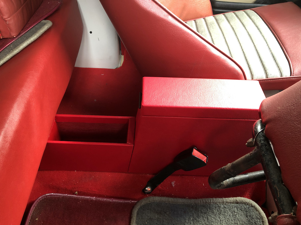 今度のコンソールはサイドブレーキ側からリアシート下まで伸びて小物入れも追加しました。